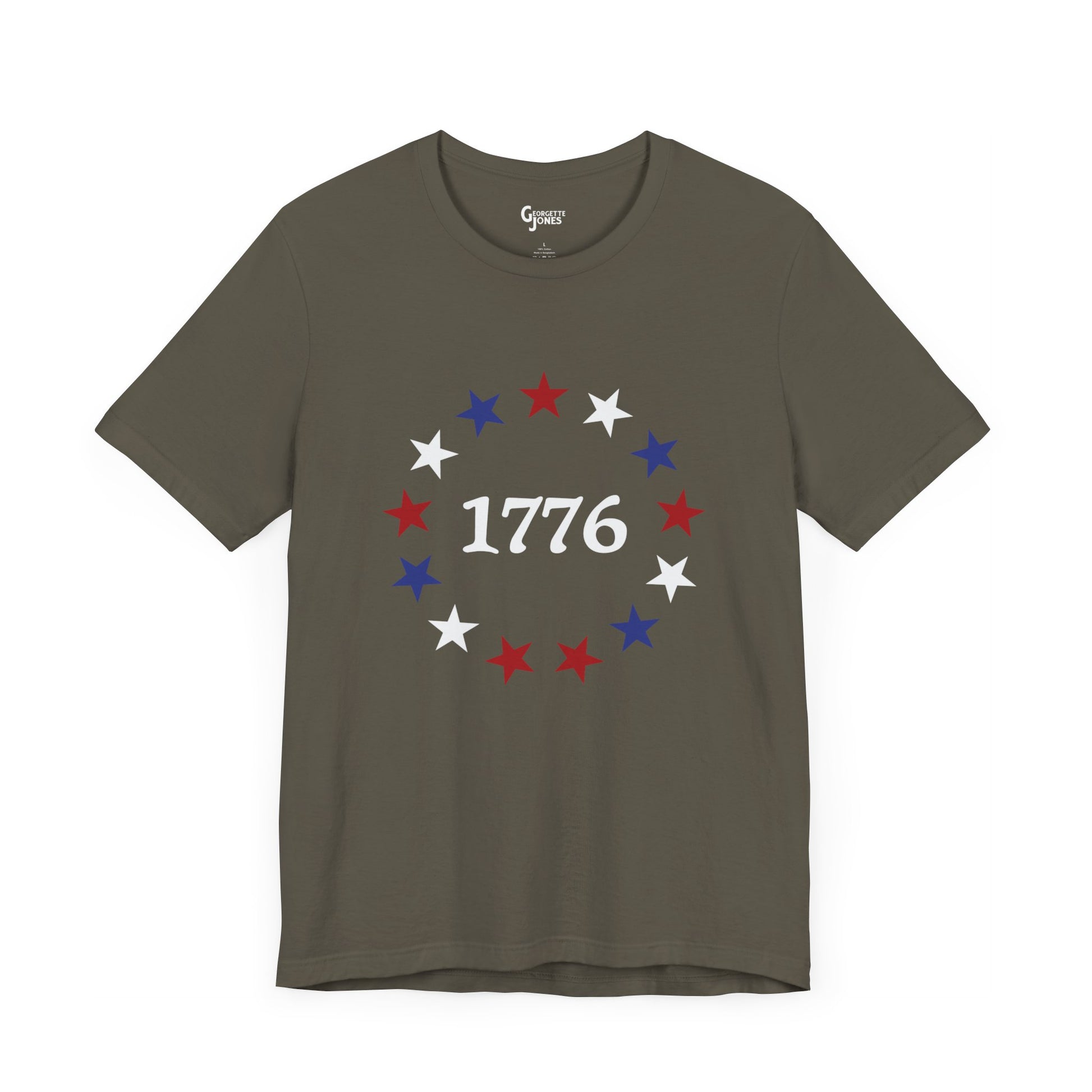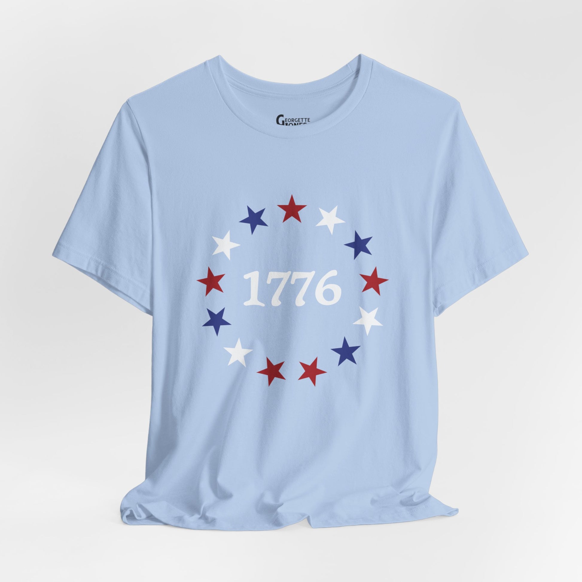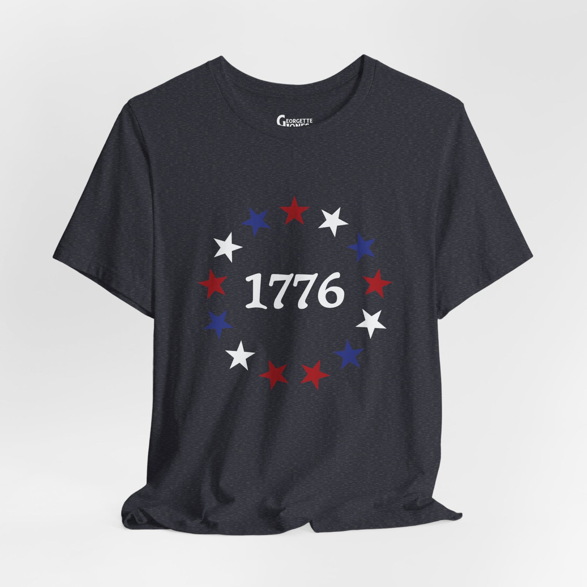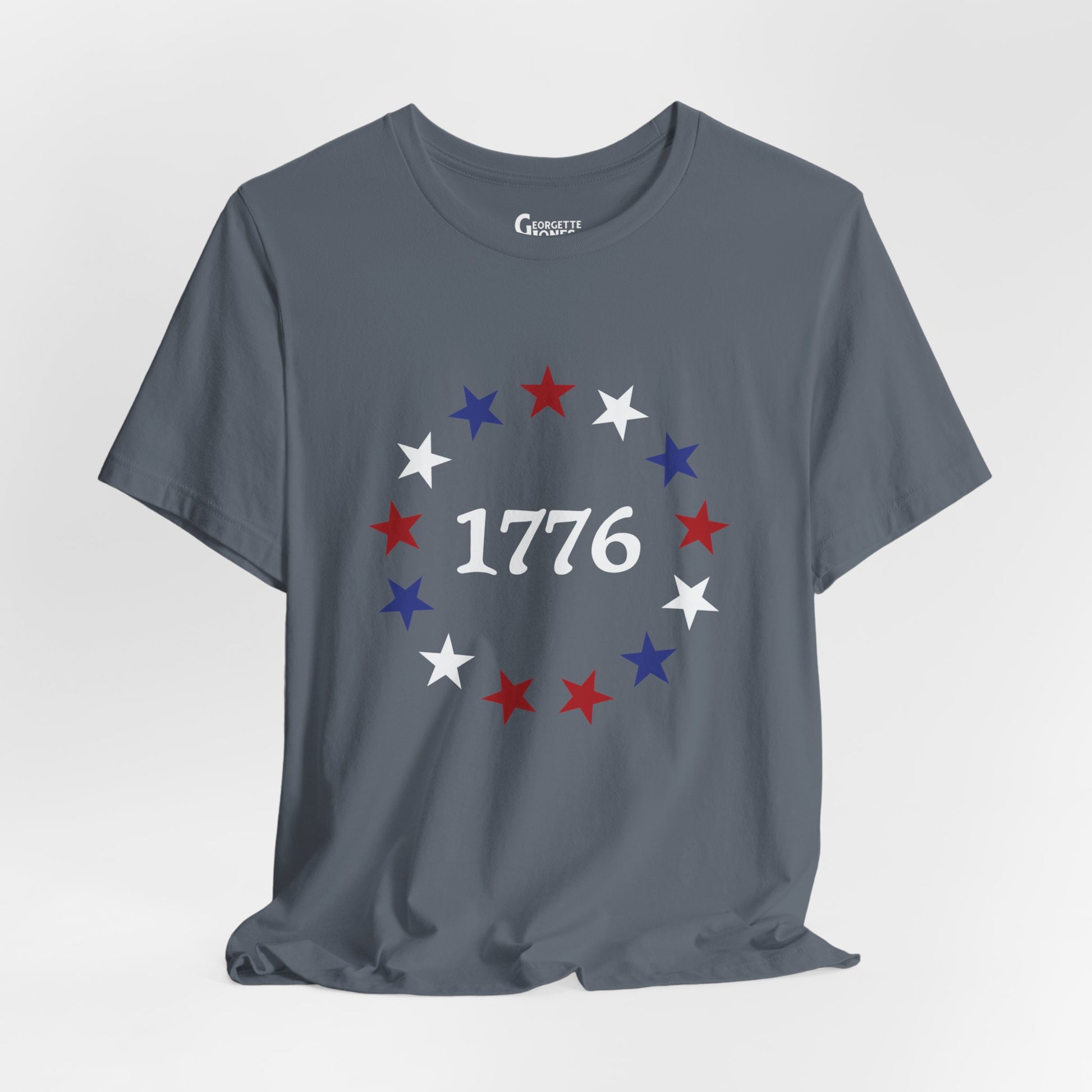 Celebrate American pride with our exclusive "1776" t-shirt, featuring a timeless design of stars in red, white, and blue encircling the iconic year of our nation's founding. Crafted for patriots who cherish liberty and history, this shirt proudly embodies the spirit of independence. Wear your pride, honor our heritage!