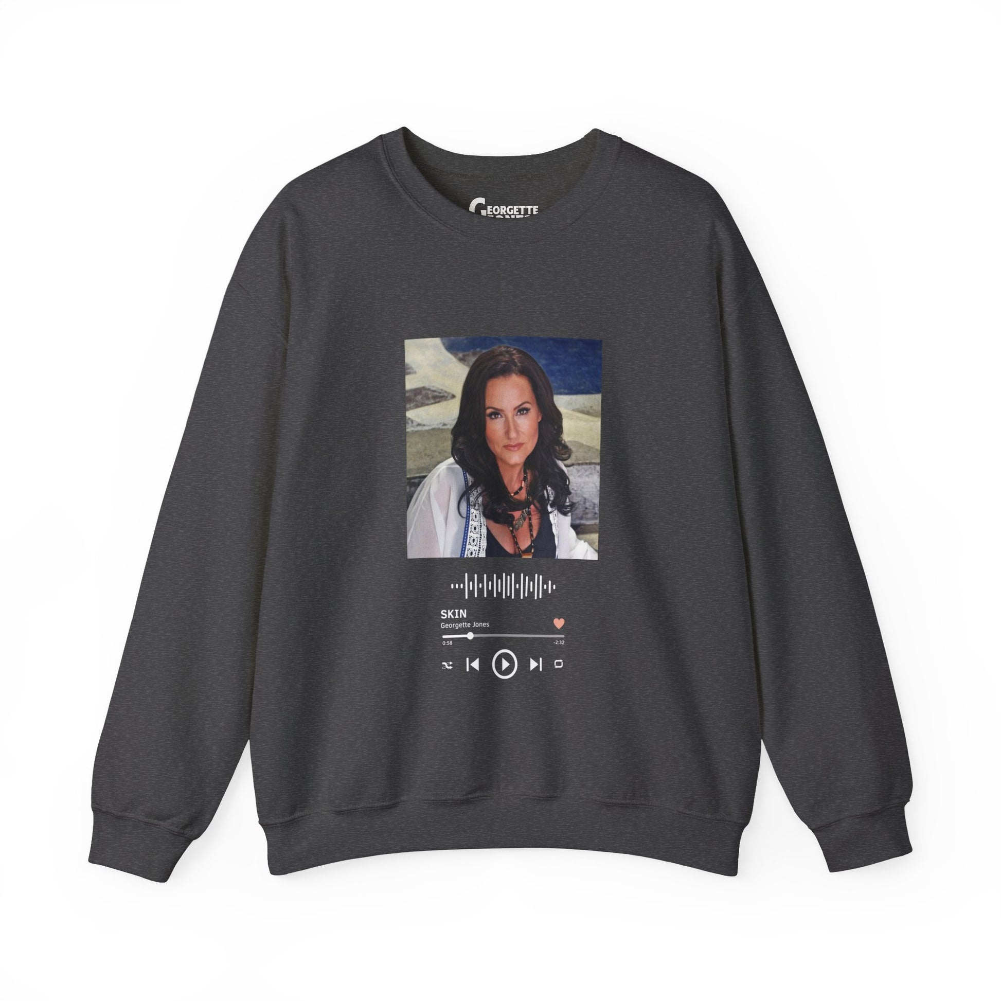 Our exclusive Sweatshirt features Georgette Jones, capturing her essence. Paired with the soulful track 'SKIN' from her latest album, it's a fusion of fashion and music that's bound to make a statement. Limited edition, timeless appeal.