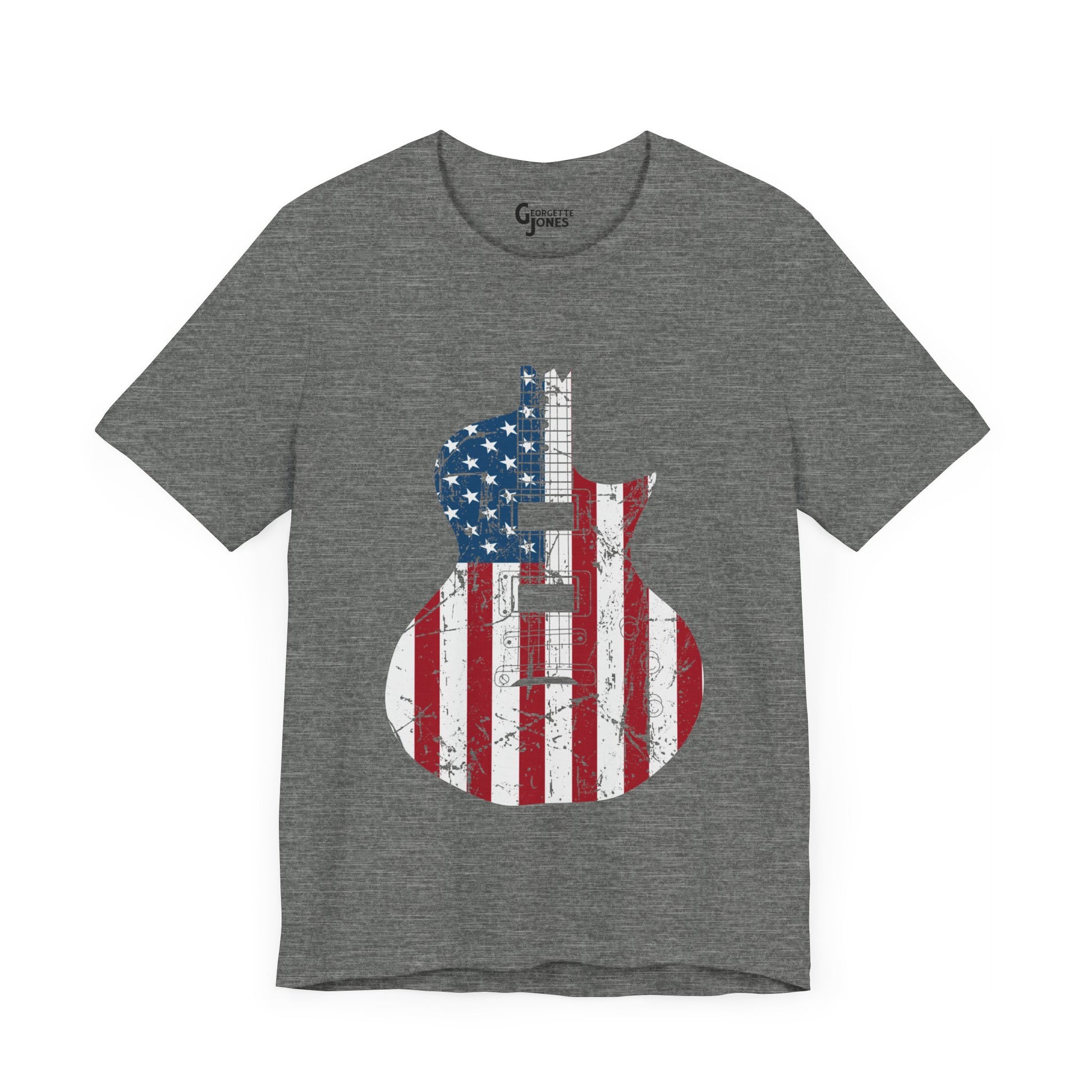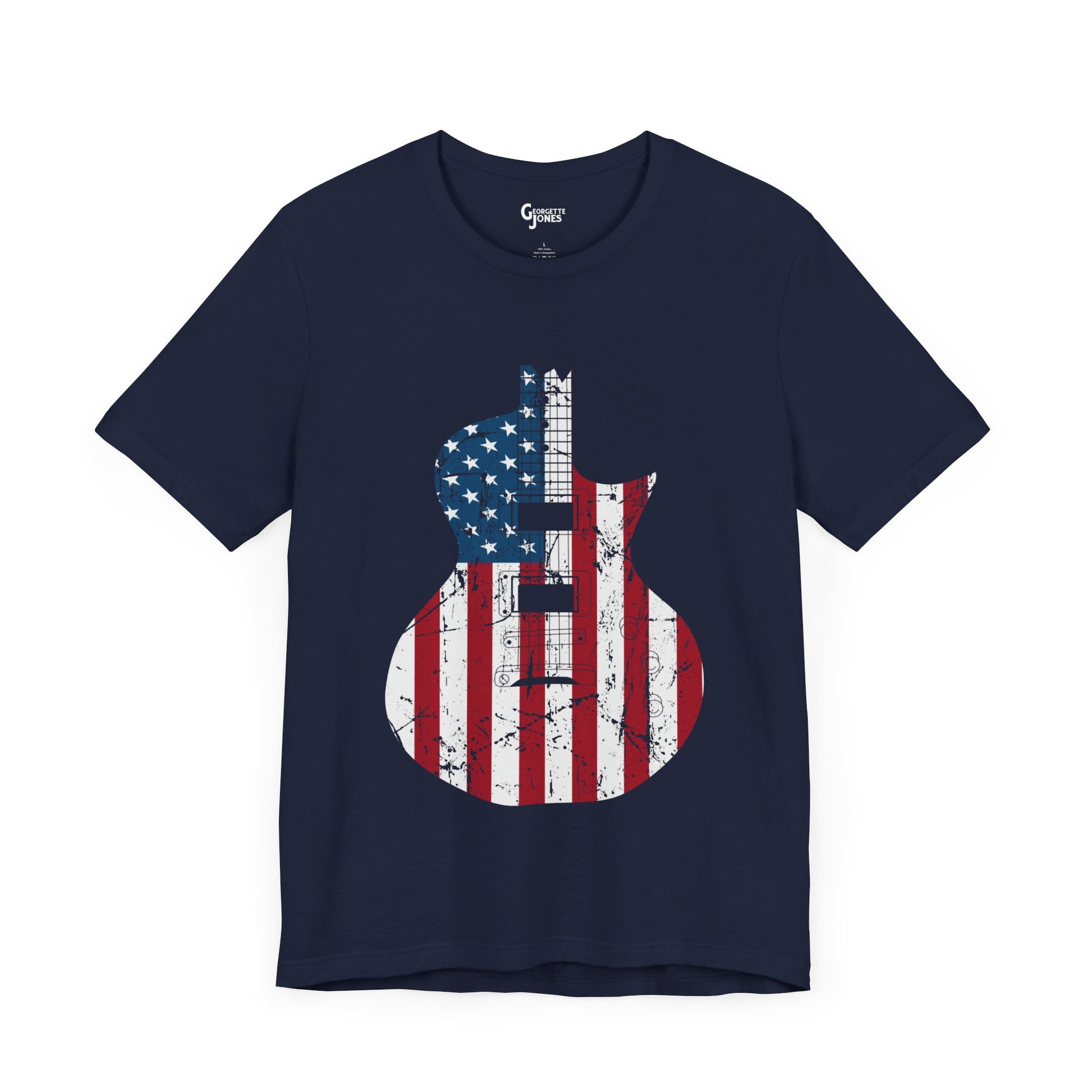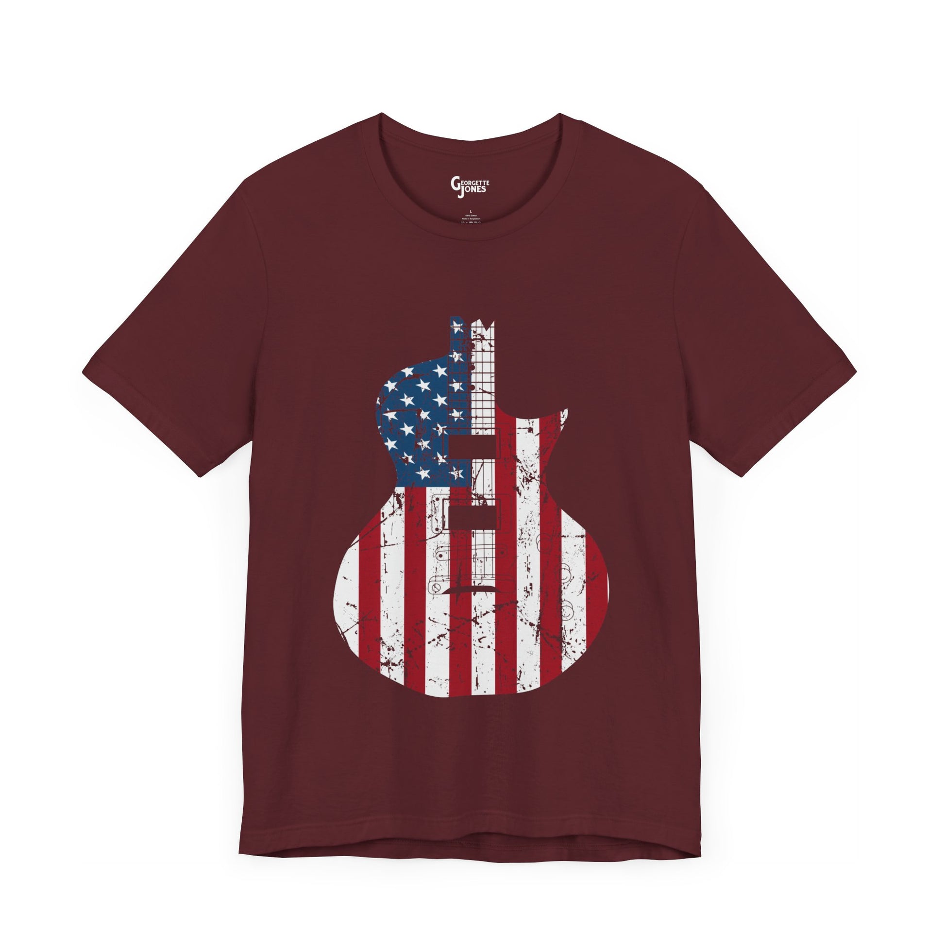 Show your patriotic pride with our unique American Flag Guitar T-shirt! This eye-catching design merges the stars and stripes with a guitar shape, perfect for music lovers and patriots alike. Comfortable and stylish, it's a must-have for any patriotic celebration. Get yours today!