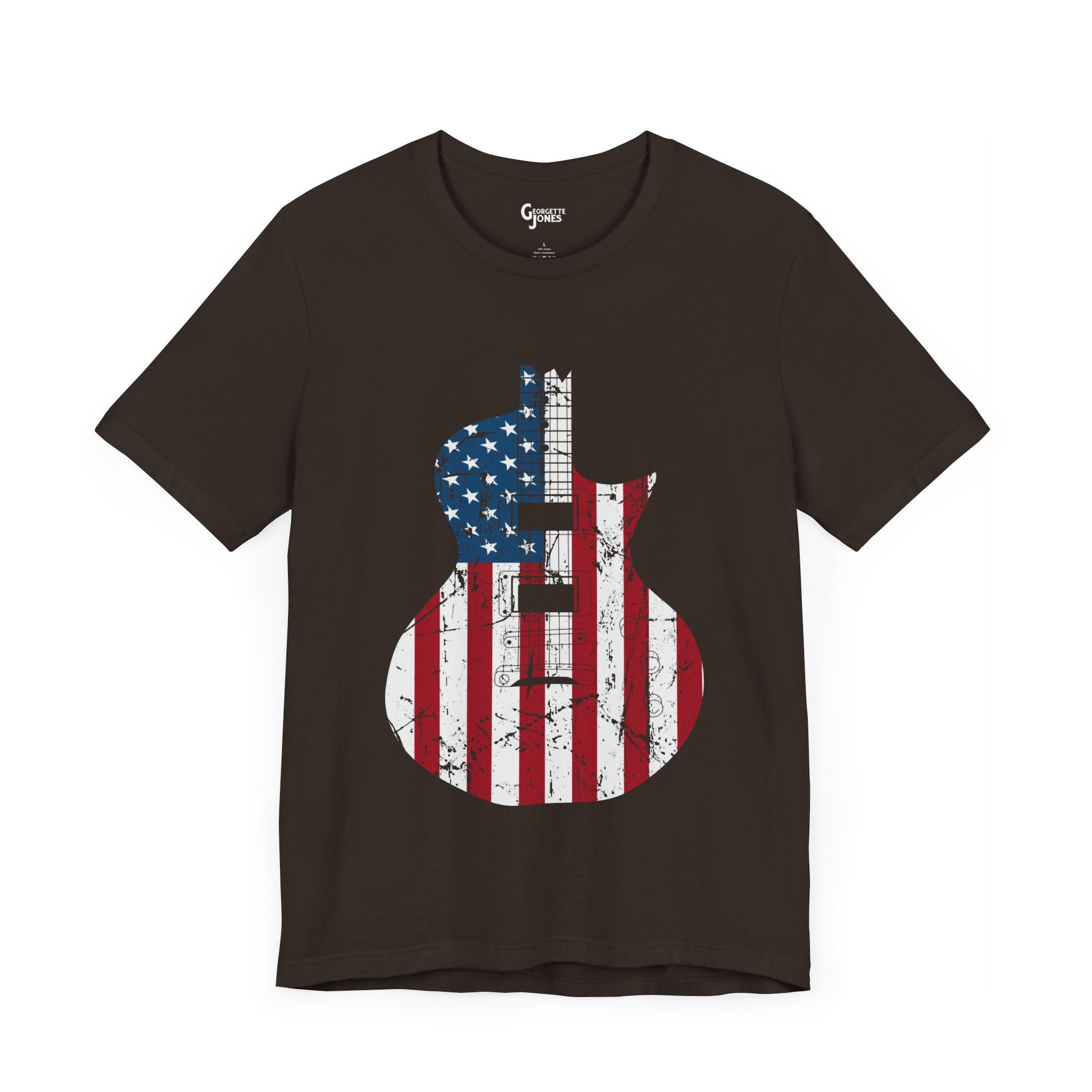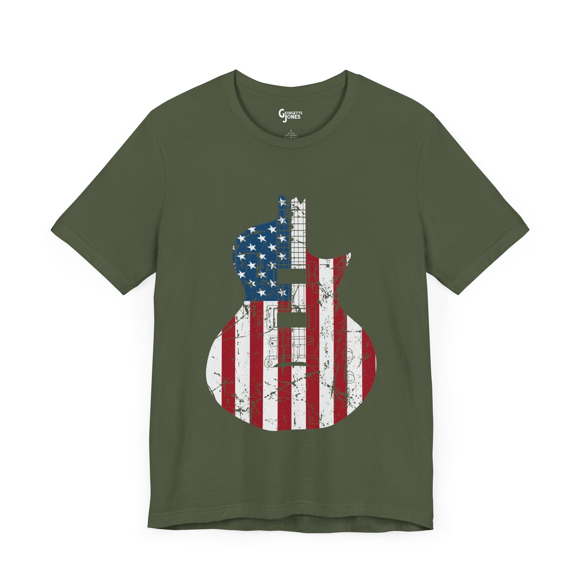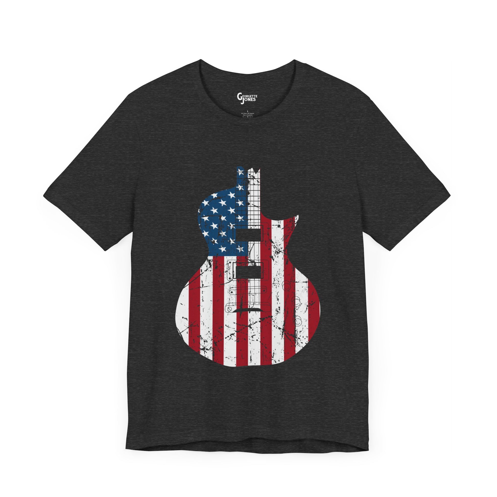Show your patriotic pride with our unique American Flag Guitar T-shirt! This eye-catching design merges the stars and stripes with a guitar shape, perfect for music lovers and patriots alike. Comfortable and stylish, it's a must-have for any patriotic celebration. Get yours today!