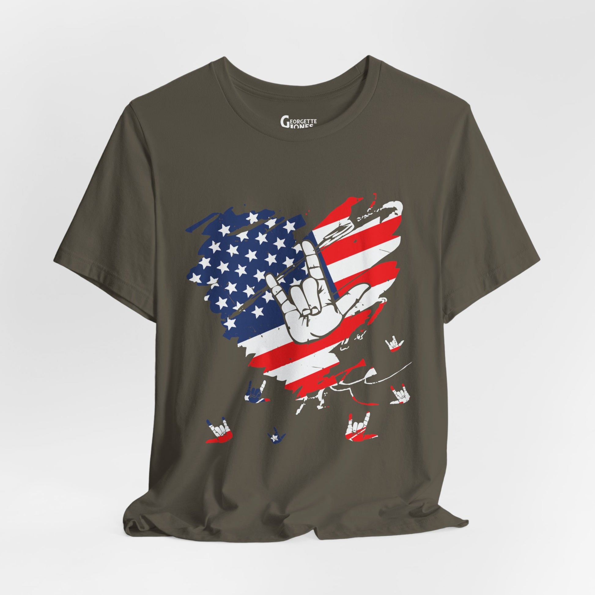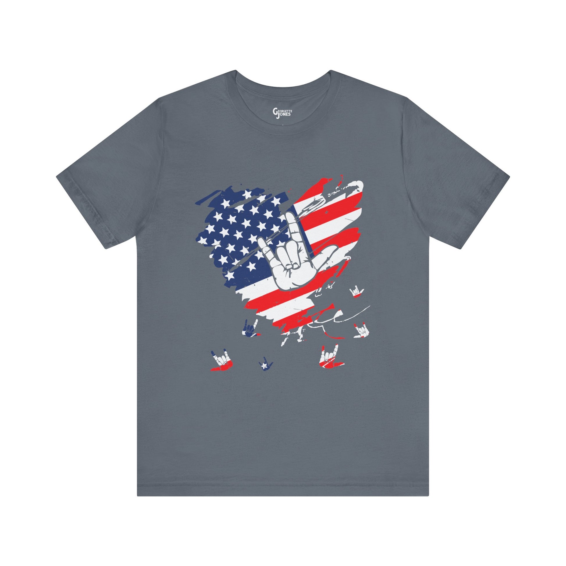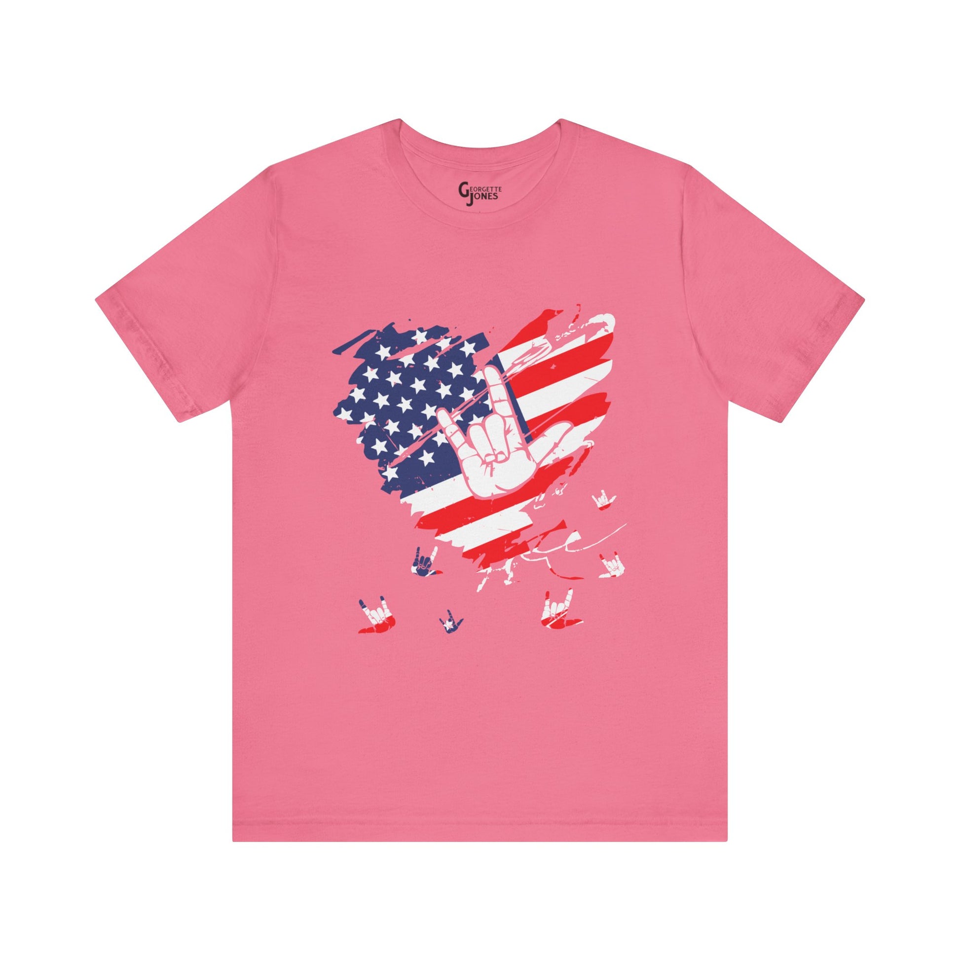 Celebrate your love for the USA with our Heart-Shaped American Flag T-Shirt. Featuring a vibrant flag in a heart design and the iconic party hand sign, this tee is perfect for patriotic festivities. Show off your American pride in style and comfort. Ideal for any patriotic celebration!