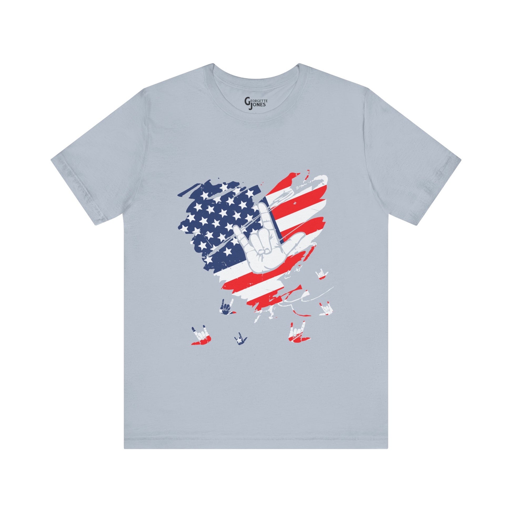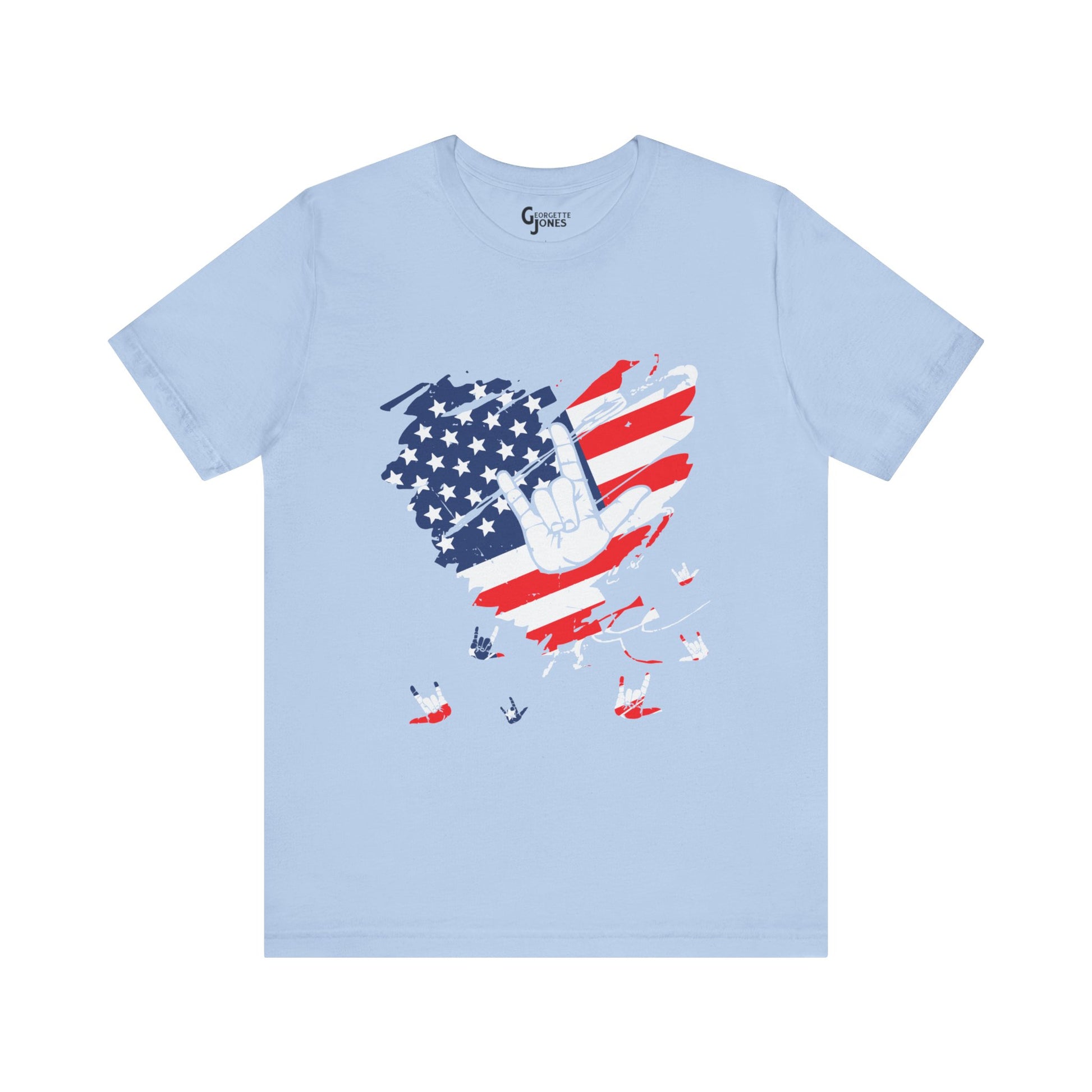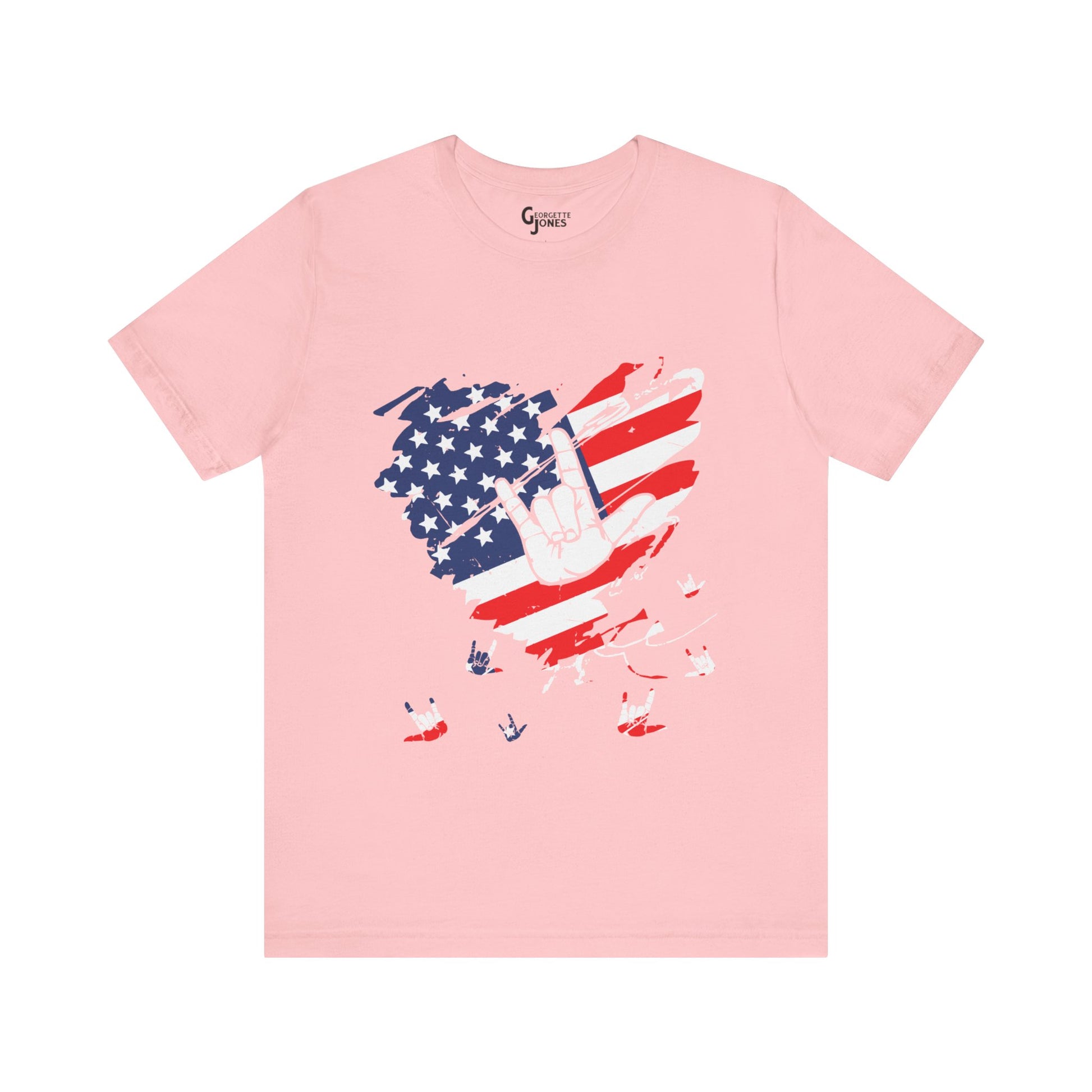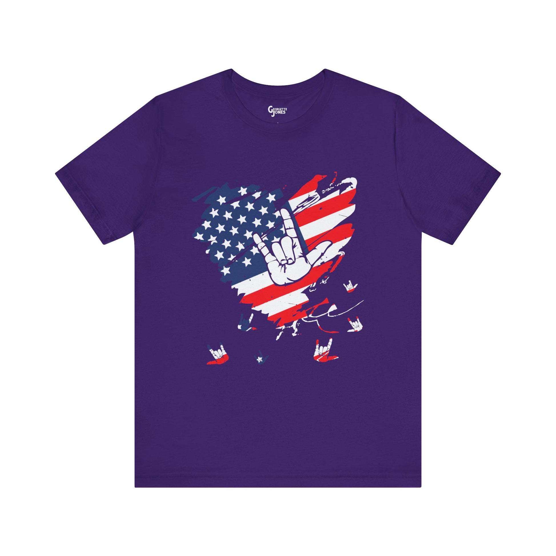 Celebrate your love for the USA with our Heart-Shaped American Flag T-Shirt. Featuring a vibrant flag in a heart design and the iconic party hand sign, this tee is perfect for patriotic festivities. Show off your American pride in style and comfort. Ideal for any patriotic celebration!