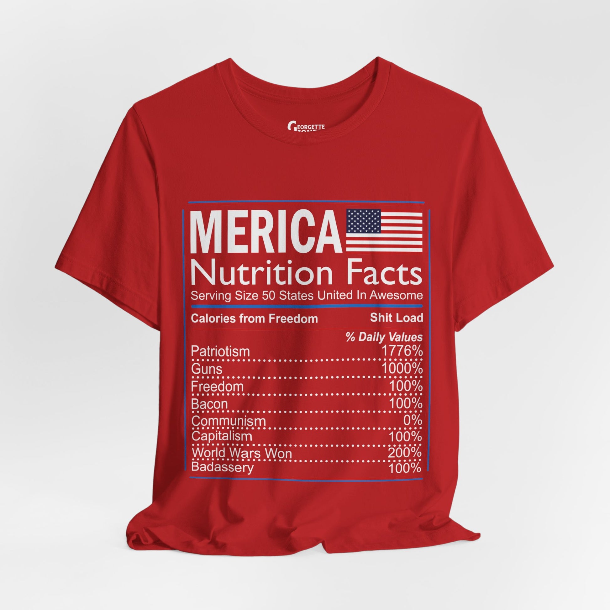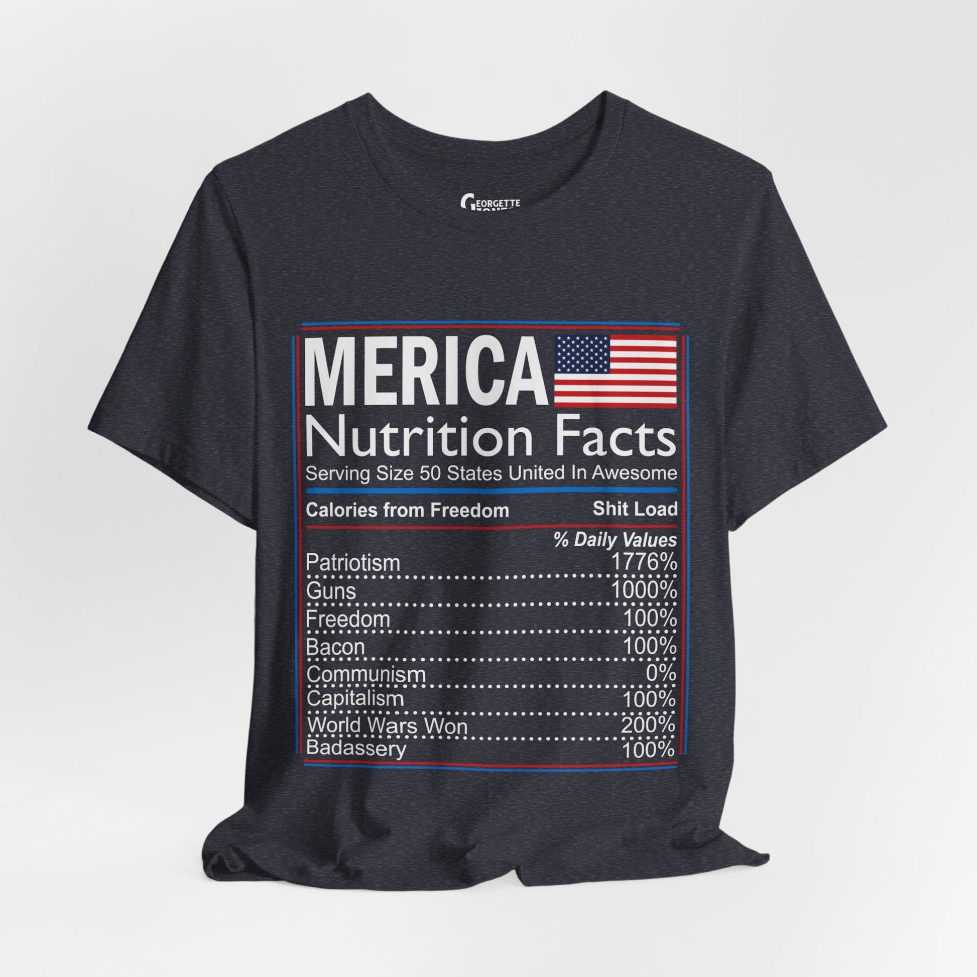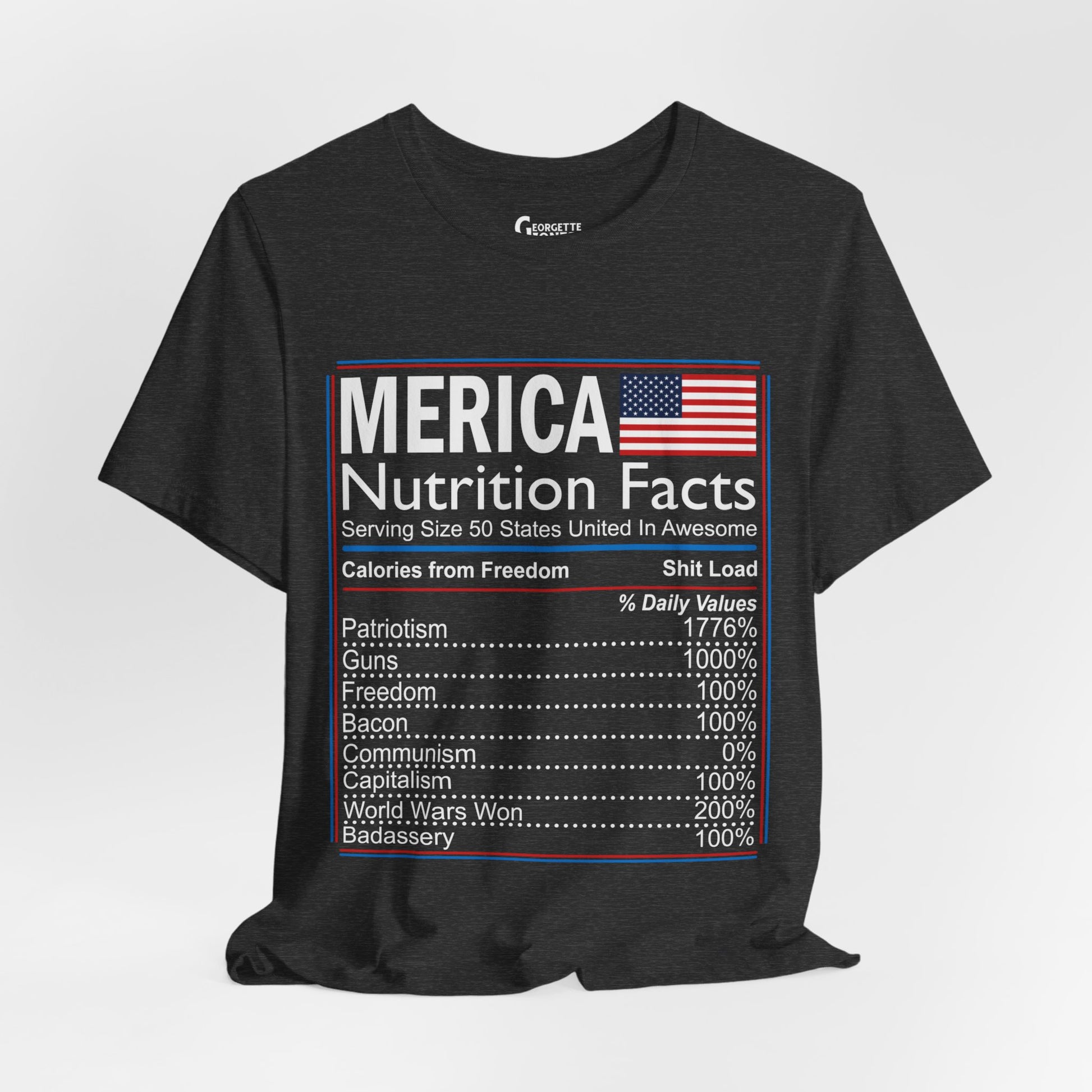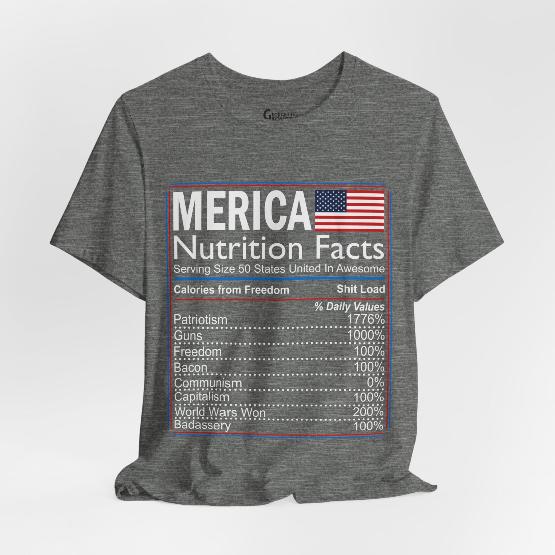 Celebrate American pride with our "Merica, Nutrition Facts" t-shirt.Featuring a playful twist on a classic label, this shirt proudly displays the essential elements of what makes America great. Perfect for everyday wear or as a patriotic gift. Show your love for the red, white, and blue!