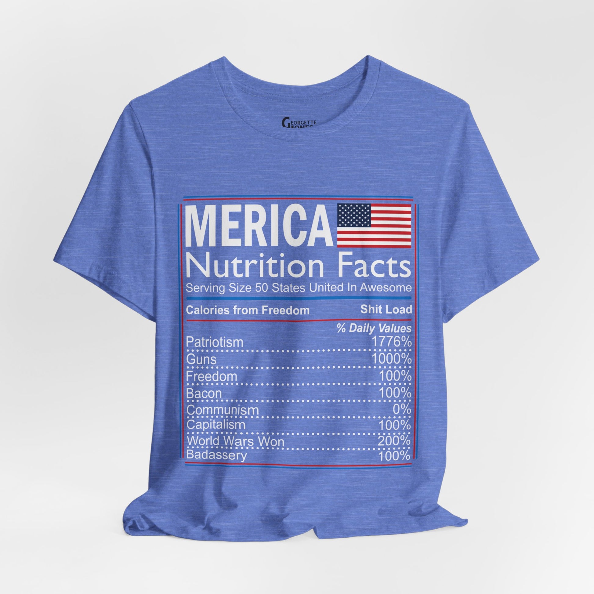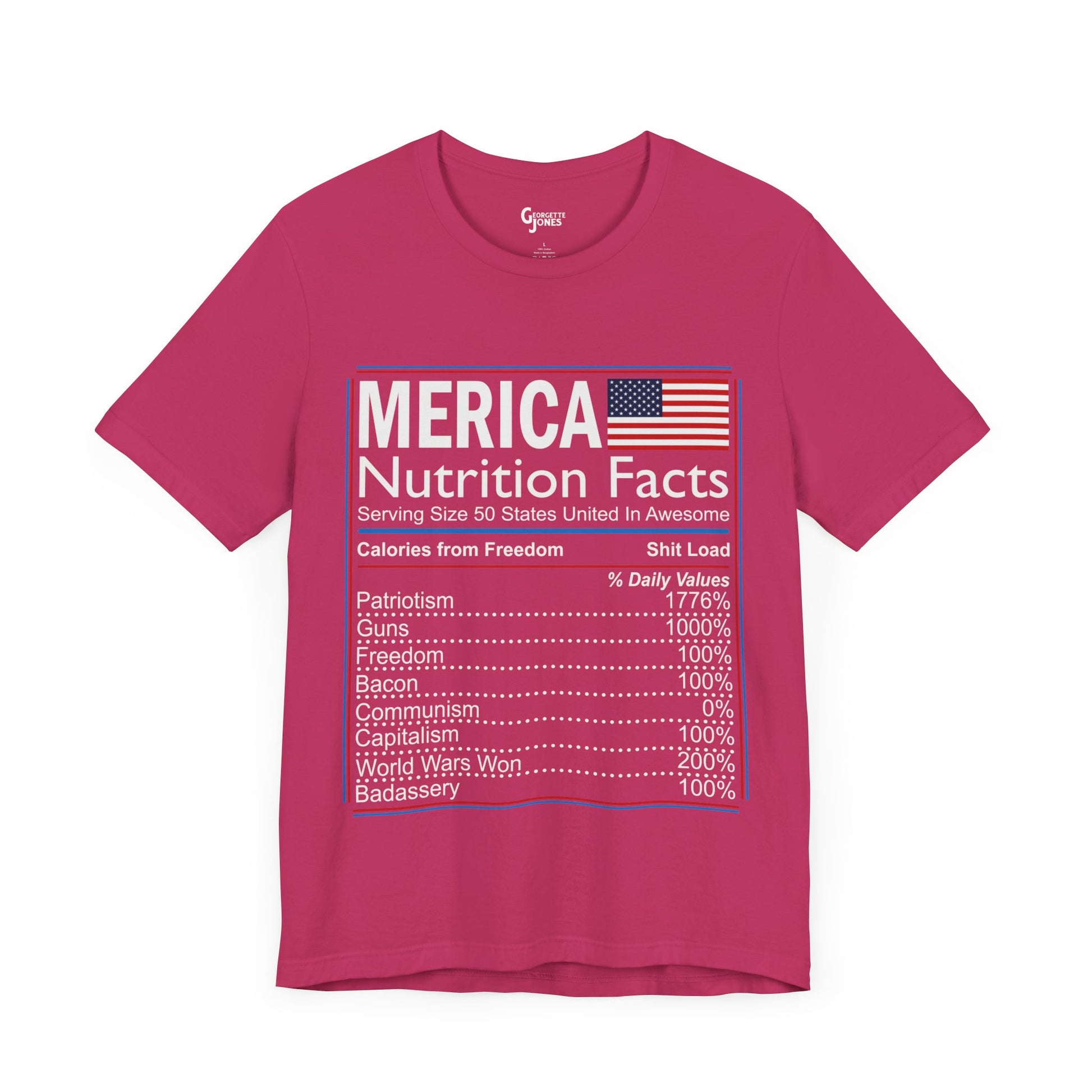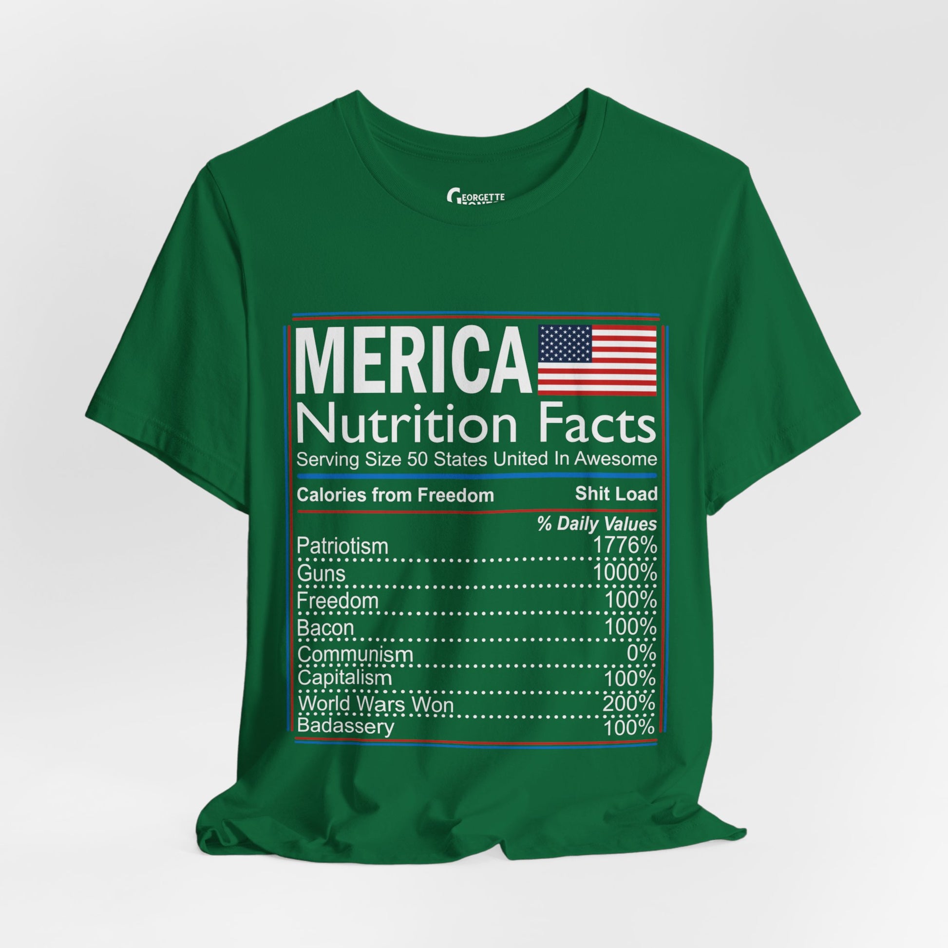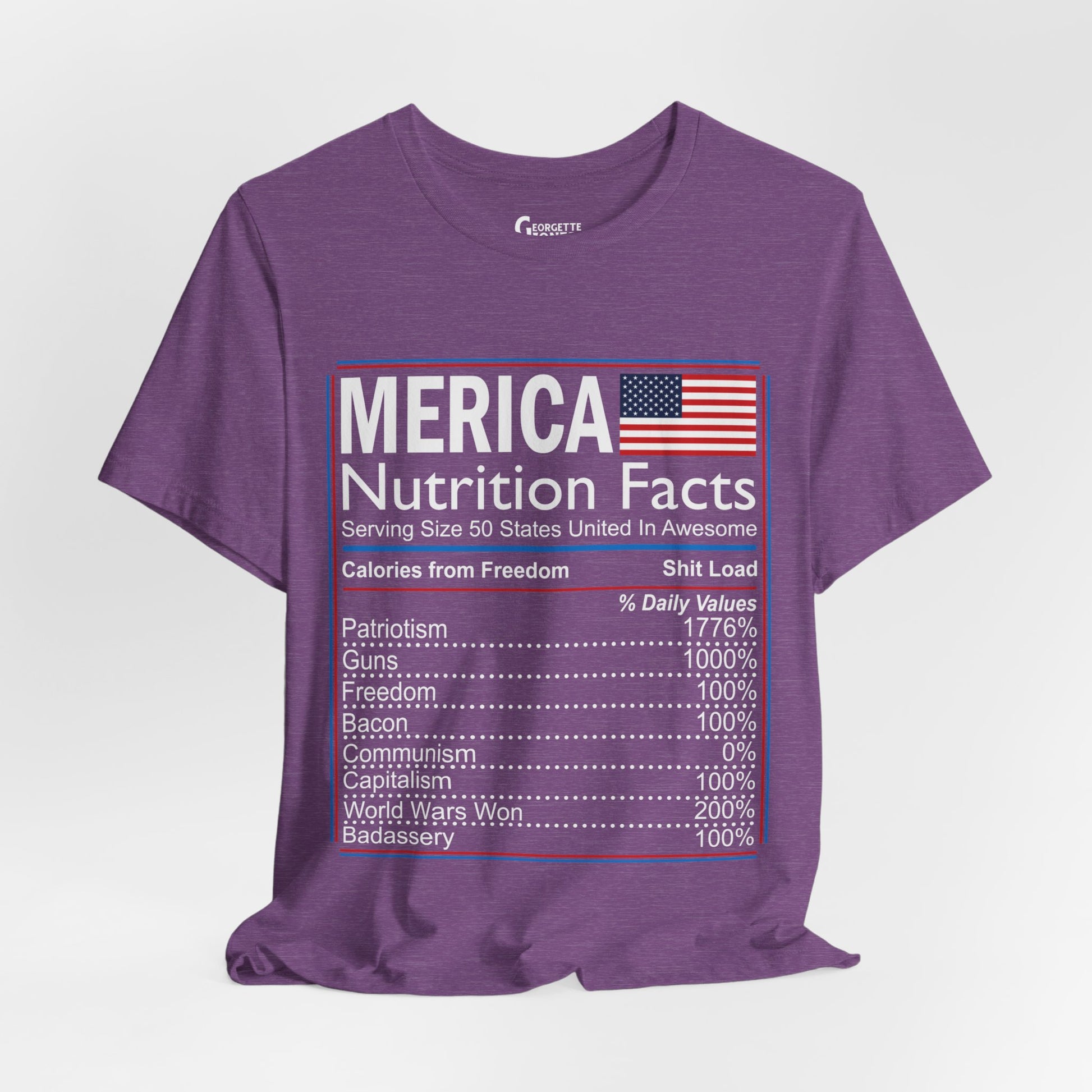 Celebrate American pride with our "Merica, Nutrition Facts" t-shirt.Featuring a playful twist on a classic label, this shirt proudly displays the essential elements of what makes America great. Perfect for everyday wear or as a patriotic gift. Show your love for the red, white, and blue!