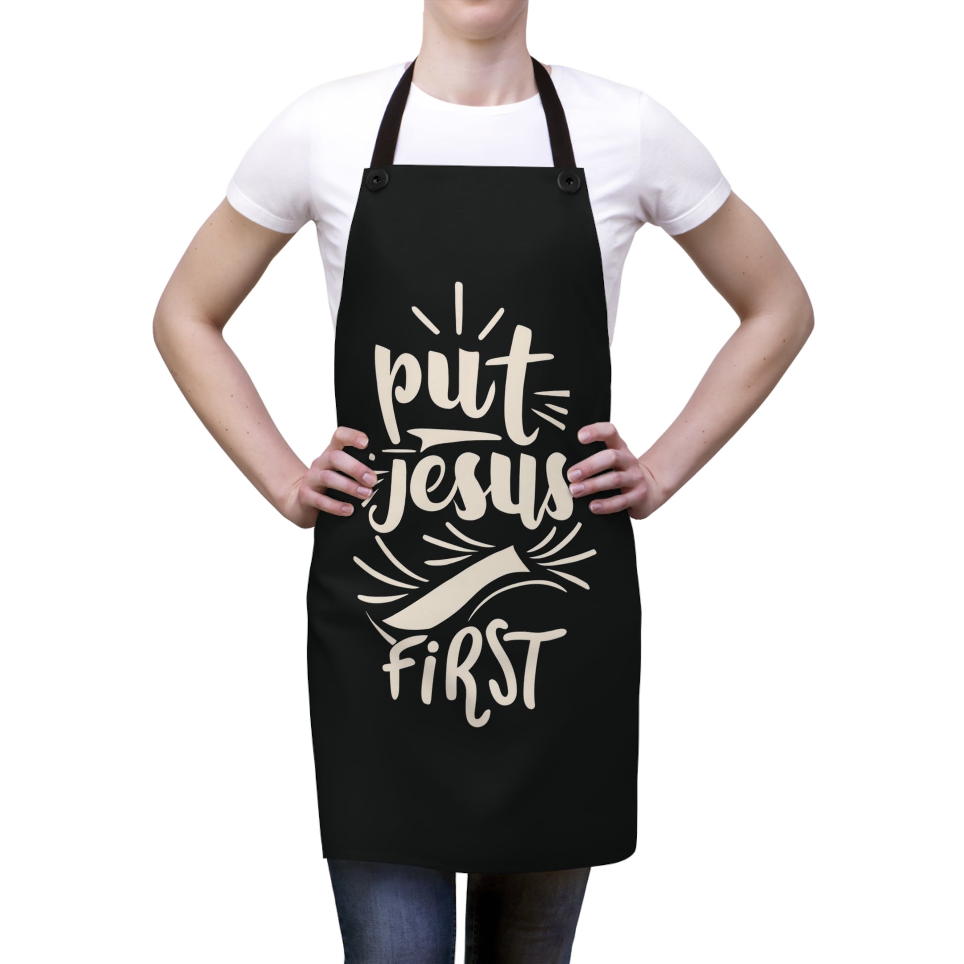 Elevate your kitchen experience with our "Put Jesus First" apron. Crafted for those who cherish faith in every moment, this apron blends style and spirituality seamlessly. Embrace divine inspiration as you cook, bake, and serve. Wear your devotion proudly and cook with a heart devoted to putting Jesus first.